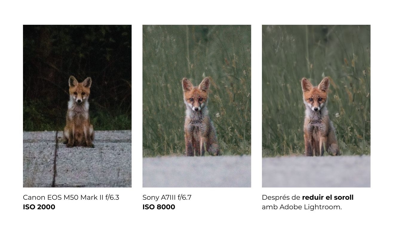 - La llum: Com comentava, moltes vegades les trobades amb les guineus eren al capvespre, quan es comença a fer fosc. Això m’obligava a treballar amb valors ISO força alts per aconseguir una bona exposició. Al principi em feia cosa pujar-la, i un dels errors que cometia era reduir la velocitat d’obturació per deixar entrar més llum sense augmentar la sensibilitat. El resultat? Les fotos sortien mogudes, perquè hi havia dies que les petites no paraven quietes ni un segon. Però a base de prova, error i guineus vaig anar agafant confiança amb el nou equip i a poc a poc vaig anar pujant la ISO i augmentant la velocitat d’obturació per congelar el moviment. Així, m’assegurava que no sortissin ni mogudes ni massa fosques. Prefereixo una foto amb una mica de gra però amb l’animal nítid, que no pas una imatge suposadament “neta” però amb l’animal borrós. A més, els programes d’edició com ara Adobe Lightroom tenen una opció per reduir el soroll que faig serveix sovint tant en fotografies de fauna fetes amb poca llum com en fotografia nocturna.
