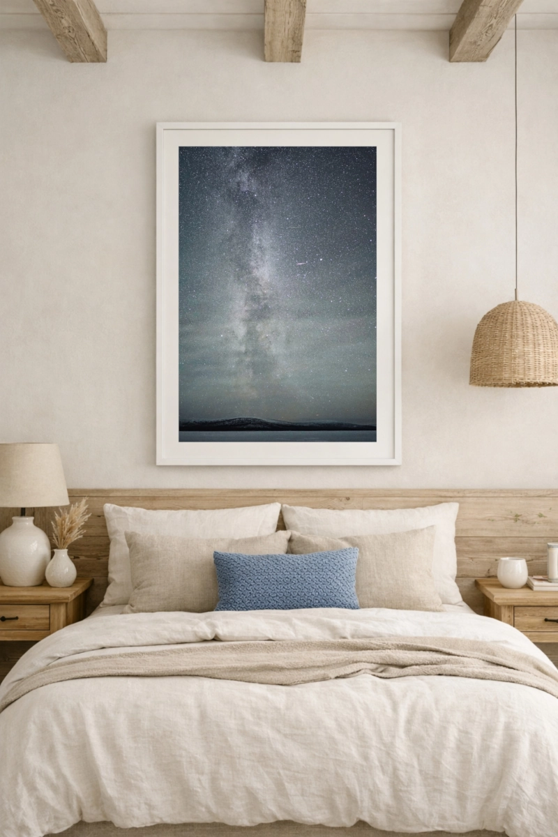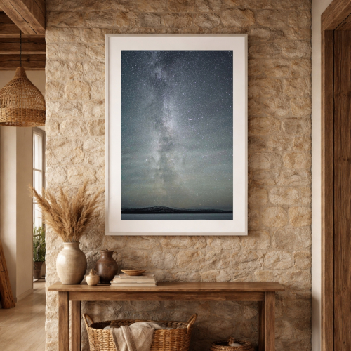 Làmina de la Via Làctia impresa en paper Fine Art mat. Aquella nit l’objectiu era capturar la grandesa de la Via Làctia sota el cel de l’àrtic, i enmig de tanta immensitat va aparèixer subtilment el cometa del segle a la part inferior dreta. La natura, a vegades, et sorprèn i et regala més del que busques.